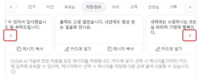 직장동료를 선택했더니 직장동료에게 적절한 새해 인사들이 쭈욱 나옵니다. 좌우 화살표를 눌러서 다른 메시지들을 볼 수 있고, 메시지들은 길이가 긴 것부터 간단하고 짧은 것까지 다양합니다. 마음에 드는 메시지를 선택하셨나요? 그러면 카드에 넣기를 눌러줍니다.
